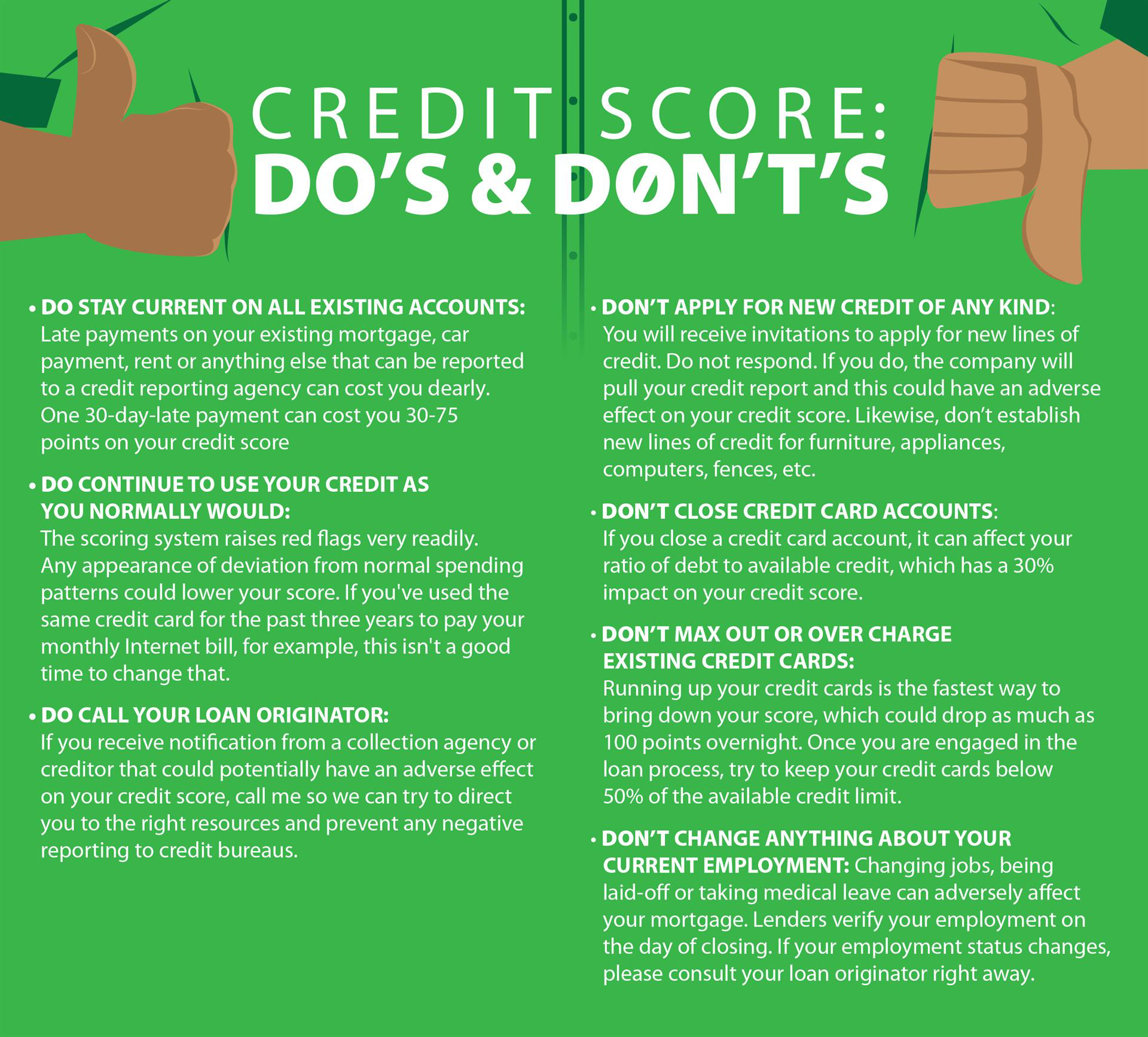 When you‘re looking around for a mortgage, one thing you’ll hear often is the importance of maintaining a good credit score. We want to get an idea of your overall financial situation, and that of any co-borrowers. Here are some additional tips to help you achieve a good credit score: